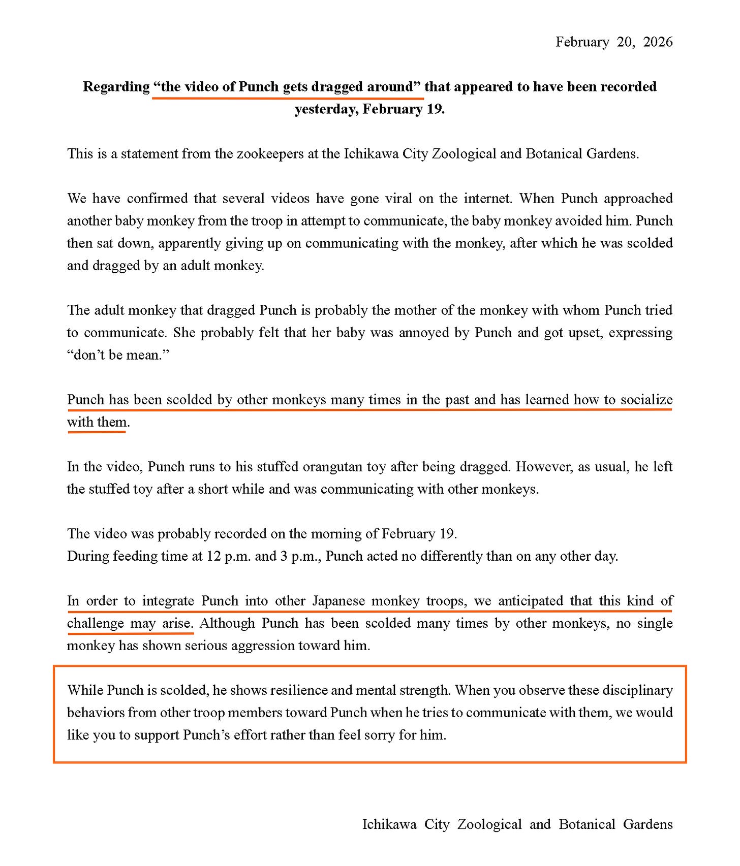 the letter from the zoo also said: “while punch is scolded, he shows resilience and mental strength. when you observe these disciplinary behaviors from other troop members toward punch when he tries to communicate with them, we would like you to support punch’s effort rather than feel sorry for him.”
