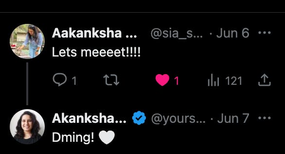 The beautiful thing about Twitter is, you can reach out to anyone and there’s a chance they might reply. That’s what Aakanksha did, she said “Lets meeeet!!!!”
